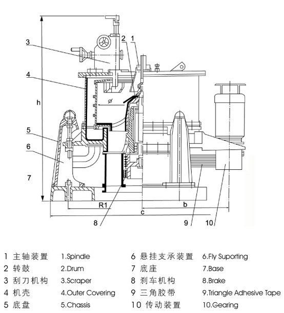 調速電動機帶動轉鼓旋轉,調節(jié)轉速至中速,物料由上部加入轉鼓經布料均勻灑布到鼓壁,升至高速后,在離心力作用下,液相穿過濾布和鼓壁濾孔排出,固相截留在轉鼓內,待轉鼓降至低速后,旋轉刮刀將固相從鼓壁刮下由離心機下部排出。